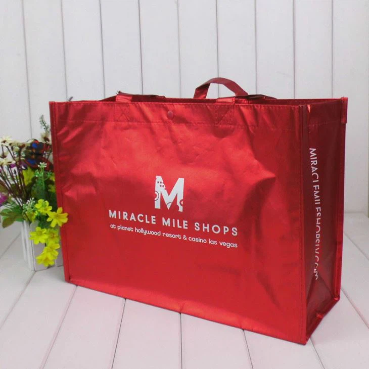 Gylden lamineret ikke-vævet indkøbspose er lavet af ikke-vævet stof og aluminiumsfilm. Den almindelige brug af aluminiumsfilmfarve er gylden, sølv, rød og rosa. Og en gylden indkøbspose har forskellige prægninger på den. Denne gyldne eller sølvfarvede taske er så attraktiv, at du vil elske den ved første øjekast.